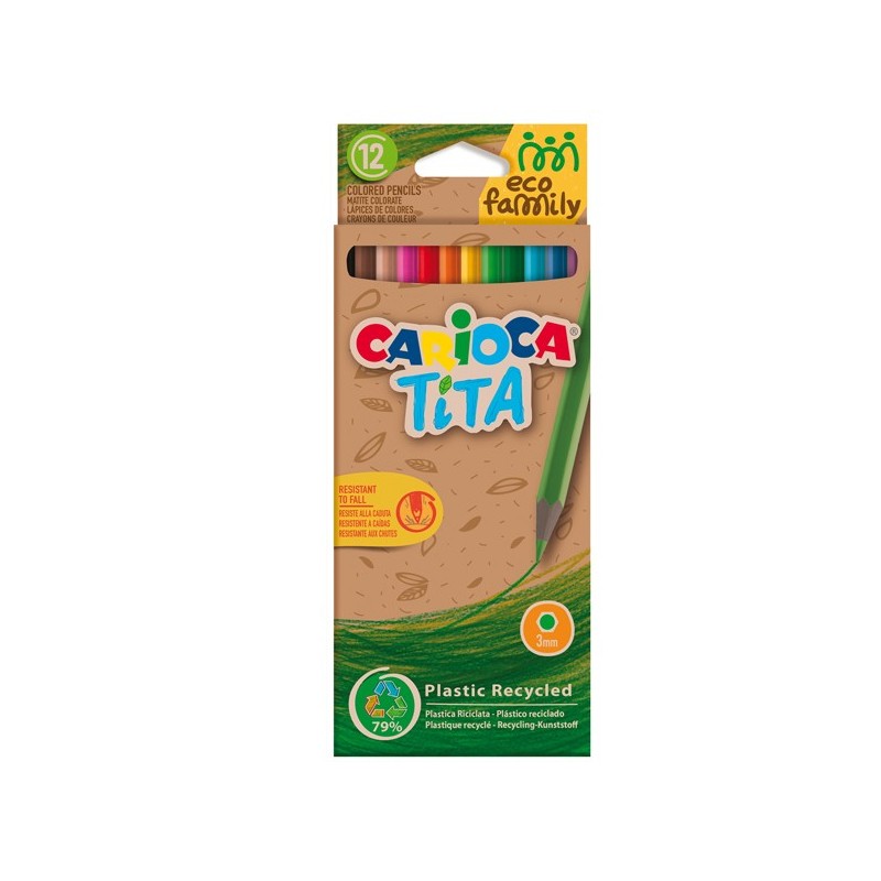 La nuova linea Eco Family Carioca® di prodotti realizzati in EcoAllene®, una materia plastica proveniente dal riciclo dei contenitori per bevande e alimenti in poliaccoppiati, utilizzati abitualmente nelle confezioni del latte e succhi di frutta. La matita è prodotta con il 79% di materiale riciclato, dotata di mina di diametro 3mm sicura e resistente alla caduta fornendo una scrittura morbida in colori brillanti.
