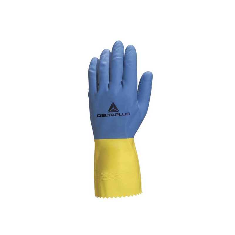 Guanti bicolori, doppia impregnatura in lattice naturale, rilievi sul palmo e sulle dita. Floccatura interna in cotone. Bordo della manichetta dentellato. Lunghezza 30cm. Spessore 0,60mm. Trattamento batteriostatico e fungistatico. Morbidezza, elasticità e sensibilità tattile. Presa antiscivolo, sull'asciutto come sul bagnato. Comfort della floccatura in cotone. Uso in ambito alimentare. Buona resistenza chimica. Guanti impermeabili. Robusti. Buona resistenza all'abrasione. Resistenza allo strappo.Buona resistenza a numerosi acidi e chetoni. Buona resistenza agli oli vegetali e ai grassi animali. Adatti in ambito: Ristorazione collettiva. Preparazioni in laboratorio. Industria conserviera. Latterie. Caseifici. Igiene, lavori casalinghi. Fannricazione ed assemblaggio. Pomiciatura, decapagio. Macelli. Cure veterinarie. Pescherie. Imballaggio frutta e verdura.
