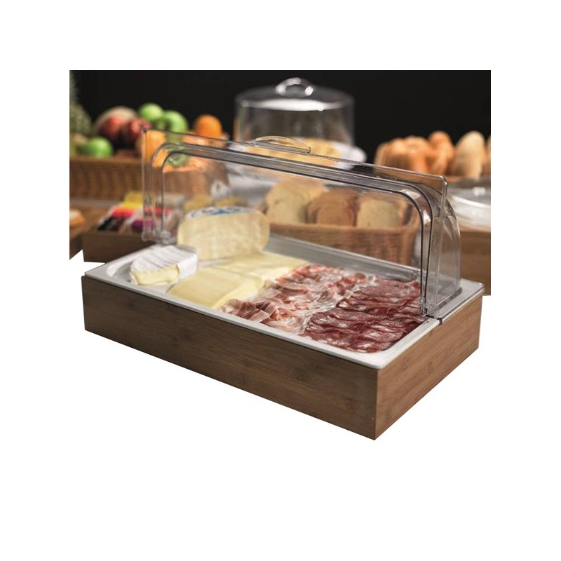 Set espositore buffet 53x32cm completo di 5 pezzi: base acacia, vassoio melamina, coperchio e 2 basi refrigeranti. Colore naturale.