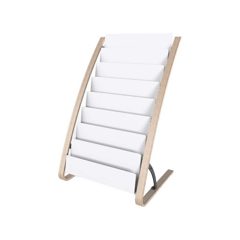 Portariviste da terra di design scandinavo. Elegante ed essenziale struttura realizzata in metallo e legno dotata di ampi scomparti dim. 24x32cm in ABS colore bianco. Incluso kit fissaggio per una facile montatura.