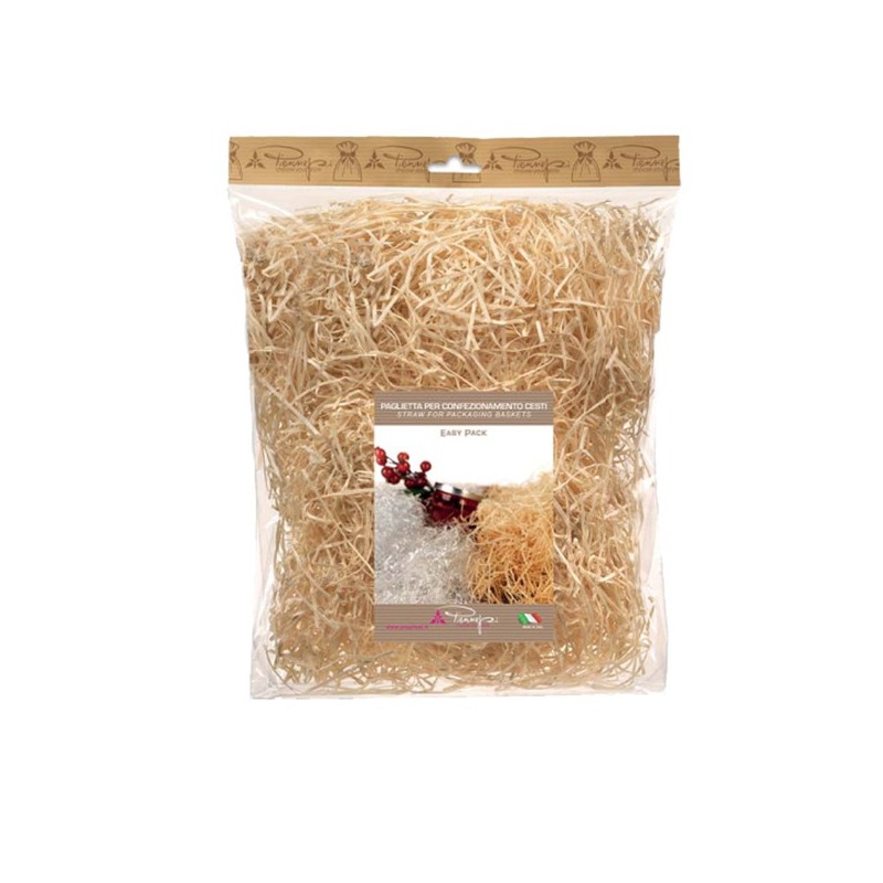 Confezione di paglietta in legno per cesti natalizi. Peso 100gr. Confezione in blister con euroforo.