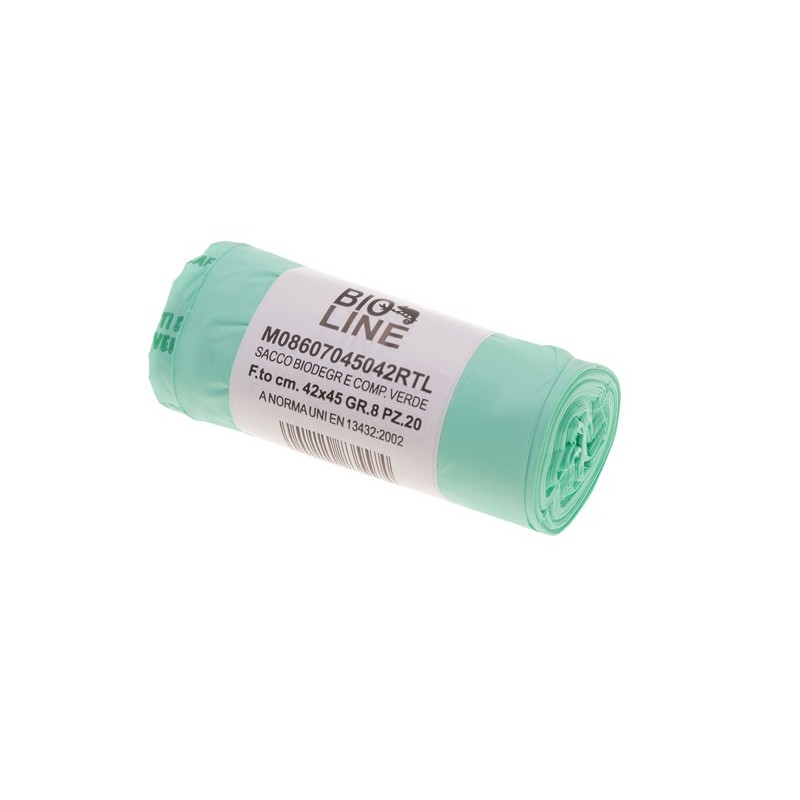 Sacchi pattumiera di colore verde in BIOPOLIMERO BIODEGRABILE e COMPOSTABILE (UNI EN 13432). Formato 42x45cm 10Lt 16µ. In rotolo da 20 sacchi. Prodotto con alta resistenza meccanica adatti alla raccolta della frazione umida.