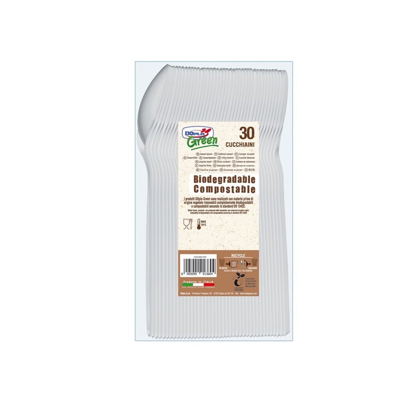 Cucchiaini di colore avorio in Estabio compostabile e biodegradabile in conformità alla norma EN 13432. Per alimenti Max 70°C. • Lunghezza 125mm • Peso unitario 1.8gr • Compostabili e biodegradabili