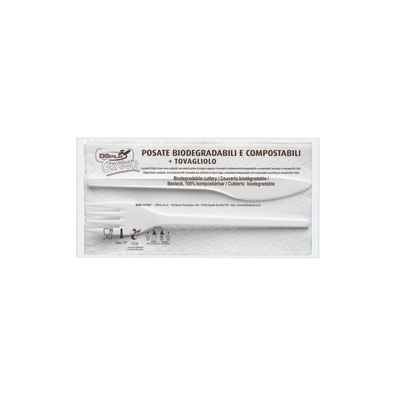 Bis posate (coltello e forchetta) di colore avorio in Estabio compostabile e biodegradabile in conformità alla norma EN 13432. Per alimenti Max 70°C. • Lunghezza posate 180mm • Tovagliolo a 2 veli 33x33cm • Compostabili e biodegradabili
