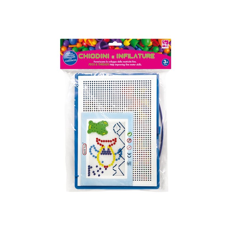 Set chiodini e infilature in plastica colorata. La confezione contiene una tavola forata, chiodini, forme e cordoncini. Adatto a +4 anni.