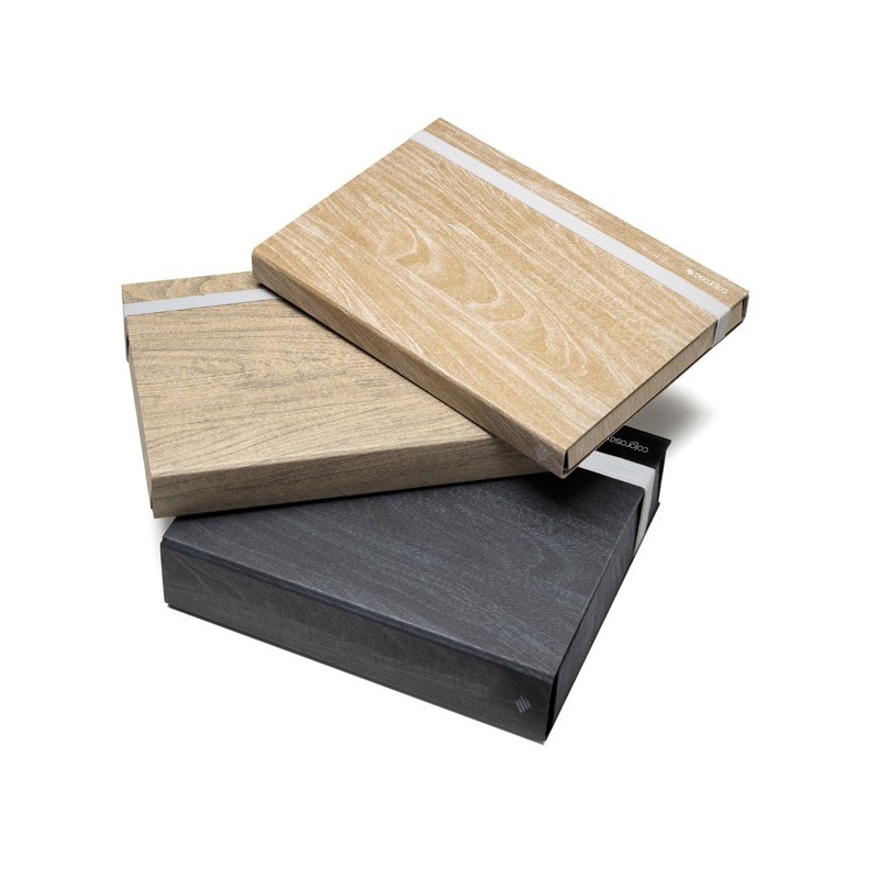 Cartella portaprogetto realizzata in cartone da 1,8mm e rivestito con carta 125gr certificata FSC® dalla trama innovativa che ricorda le venature del legno. Formato 24,5x35cm. Dotata di eastico per la chiusura. Assortita in 3 differenti colorazioni.