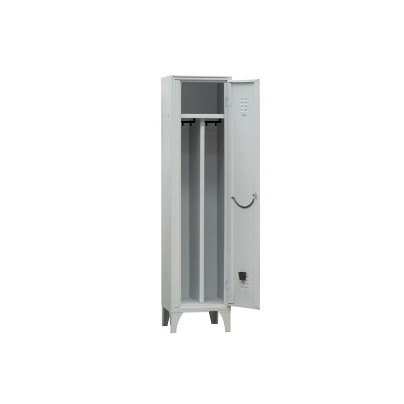 Armadio ad 1 vano con tramezza (per separazione sporco/pulito) dotato di ripiano superiore con sottostante tubo ovale porta grucce in PVC completo di ganci scorrevoli. Tramezza sporco / pulito. Porta ombrello e vaschetta raccogli gocce su anta. Porta cartellino in materiale plastico applicato all’anta. Chiusura con serratura a cilindro con doppia chiave in dotazione. Fornito montato.