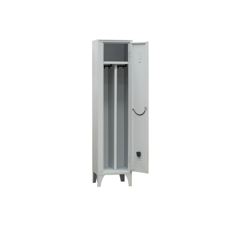 Armadio ad 1 vano con tramezza (per separazione sporco/pulito) dotato di ripiano superiore con sottostante tubo ovale porta grucce in PVC completo di ganci scorrevoli. Tramezza sporco / pulito. Porta ombrello e vaschetta raccogli gocce su anta. Porta cartellino in materiale plastico applicato all’anta. Chiusura con serratura a cilindro con doppia chiave in dotazione. Fornito montato.
