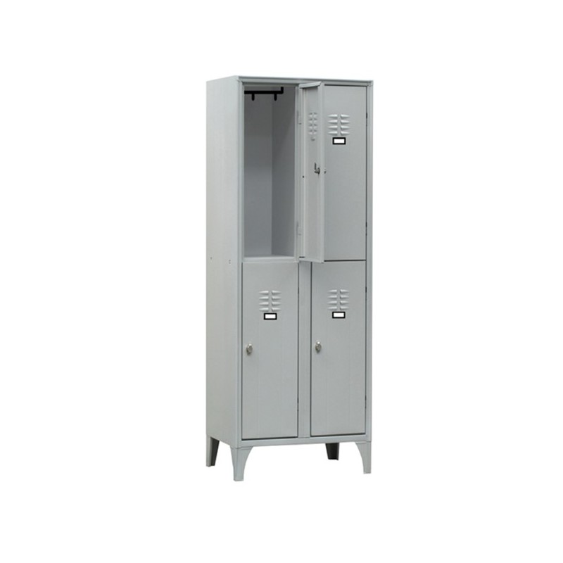 Armadio a 4 vani sovrapposti. Ogni vano è dotato di tubo ovale porta grucce in PVC completo di ganci scorrevoli non estraibili. Porta cartellino in materiale plastico applicato all’anta. Chiusura con serratura a cilindro con doppia chiave in dotazione. Fornito montato.