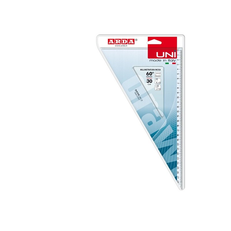 Squadra in materia plastica termoresistente di grande trasparenza e durezza superficiale, colore fume' ottico. Graduazione incisa. In busta self-service.