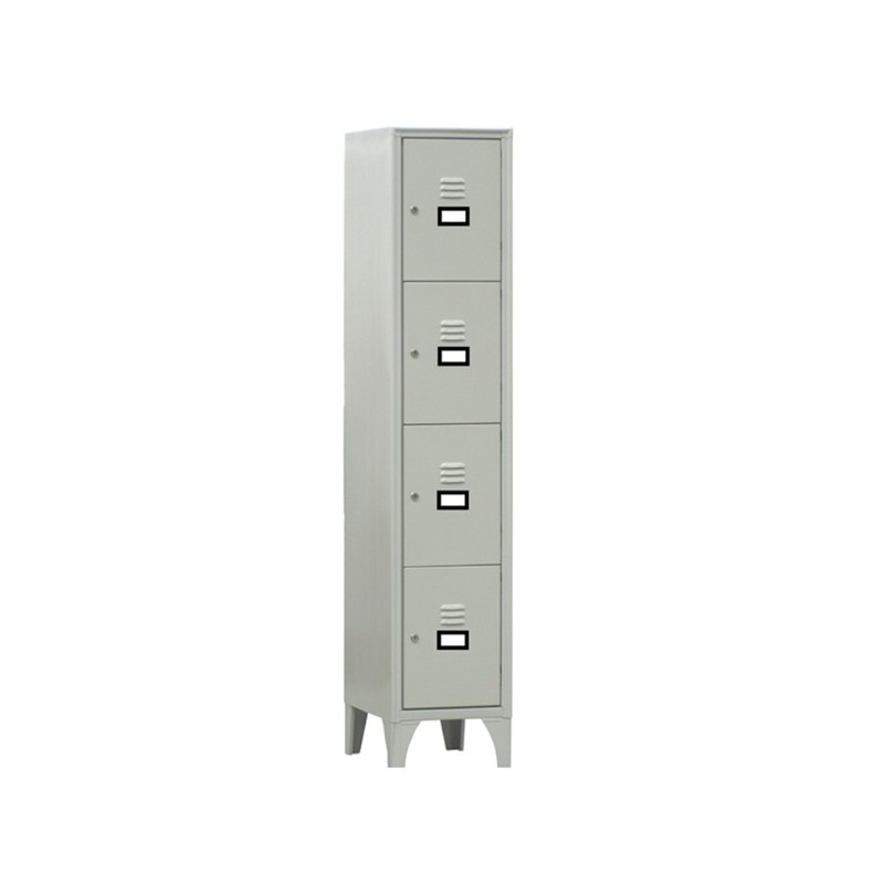Armadio casellario a 4 vani sovrapposti. Ogni vano ha un ingresso utile di L27 x H37cm ed è dotato di porta cartellino in materiale plastico applicato all’anta. Chiusura con serratura a cilindro con doppia chiave in dotazione. Fornito montato.