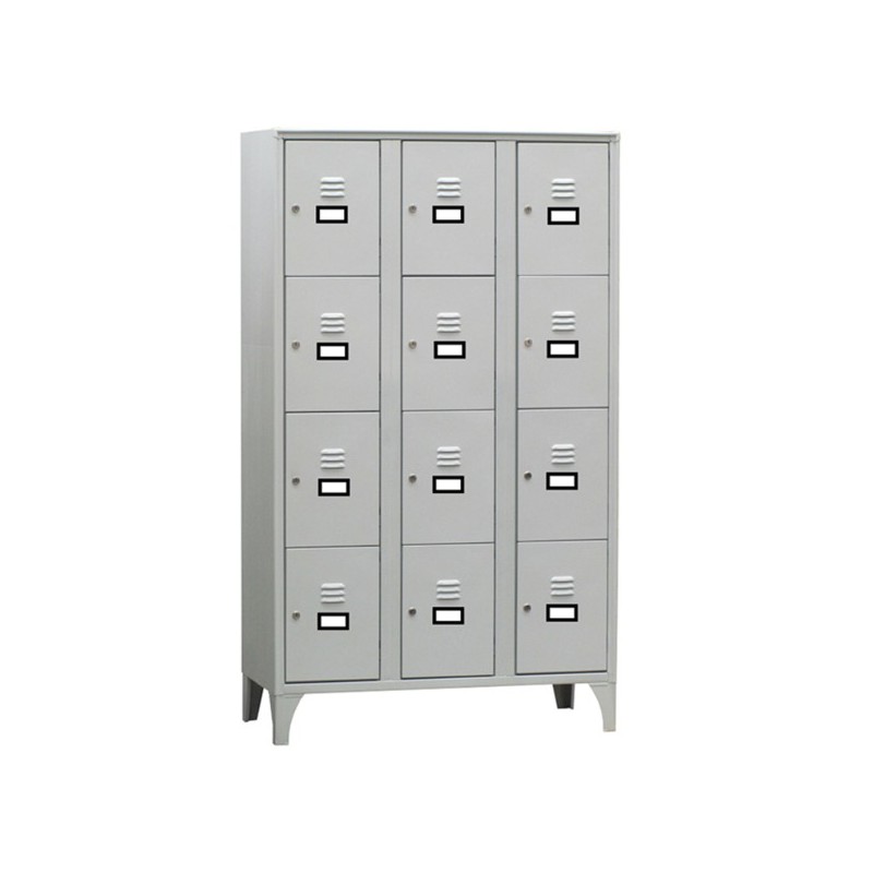 Armadio casellario a 12 vani. Ogni vano ha un ingresso utile di L27 x H37cm ed è dotato di porta cartellino in materiale plastico applicato all’anta. Chiusura con serratura a cilindro con doppia chiave in dotazione. Fornito montato.