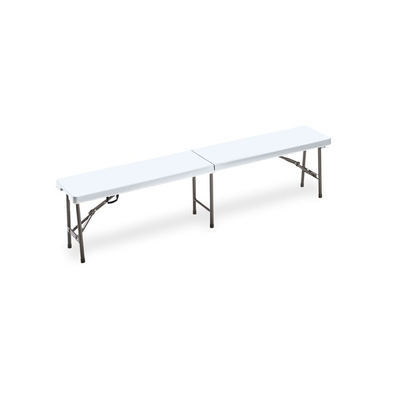 Panca HORECA rettangolare pieghevole di colore bianco. Struttura in acciaio verniciato con vernici epossidiche color grigio e top in HDPE di colore bianco pieghevole. Dimensioni: H44 x P30 x L183cm - 8,6kg.Articolo destinato ad esclusivo uso domestico. Non adatto ad uso pubblico.