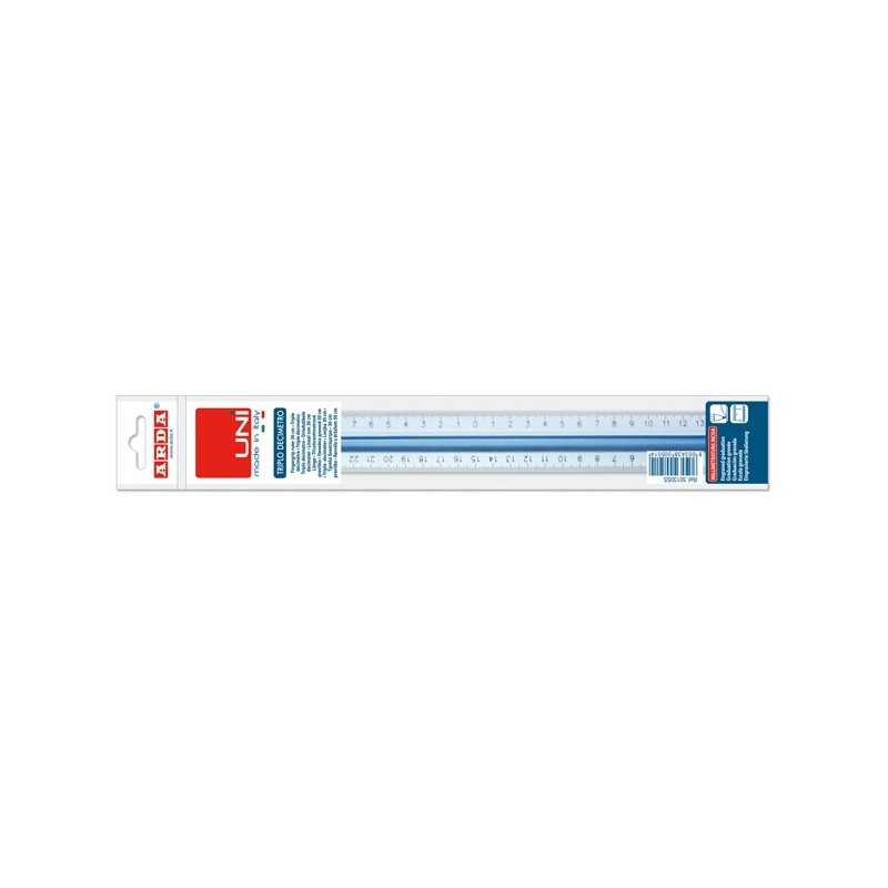Triplodecimetro con impugnatura lunga in materia plastica termoresistente di grande trasparenza e durezza superficiale, colore fume' ottico. Graduazione incisa. In busta self-service.