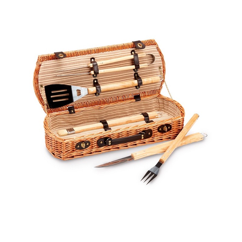 Valigetta in vimini contenente una pinza, una paletta, un coltello, una forchetta e un pennello. Dimensioni: H13 x P26 x L61cm.Articolo destinato ad esclusivo uso domestico. Non adatto ad uso pubblico.