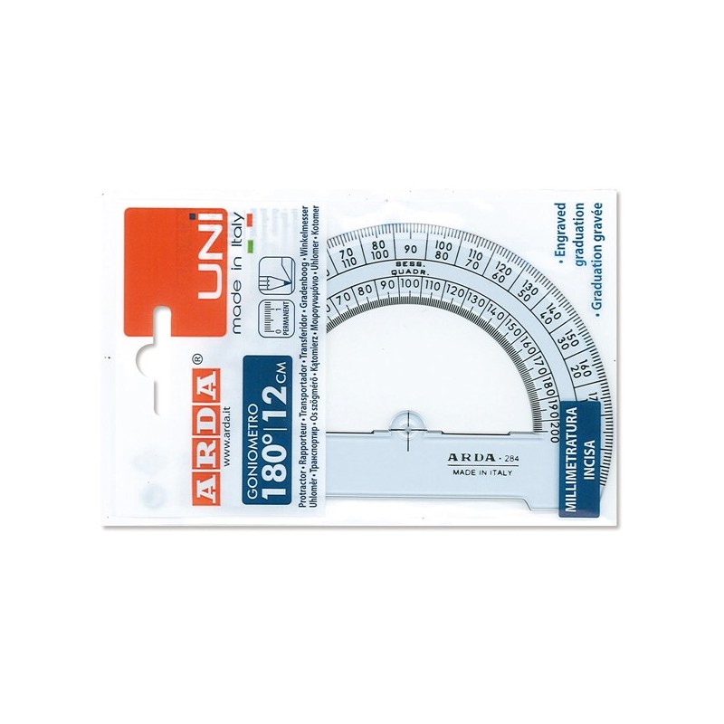 Goniometro in materia plastica termoresistente di grande trasparenza e durezza superficiale, colore fume' ottico. Graduazione incisa. In busta self-service.