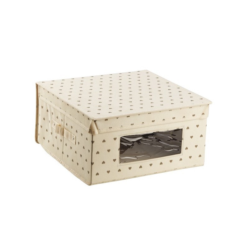 Scatola King Box in TNT con finestra. Adatta per riporre indumenti. Colore panna con fantasia a cuori. Dimensioni:36x36x19h cm