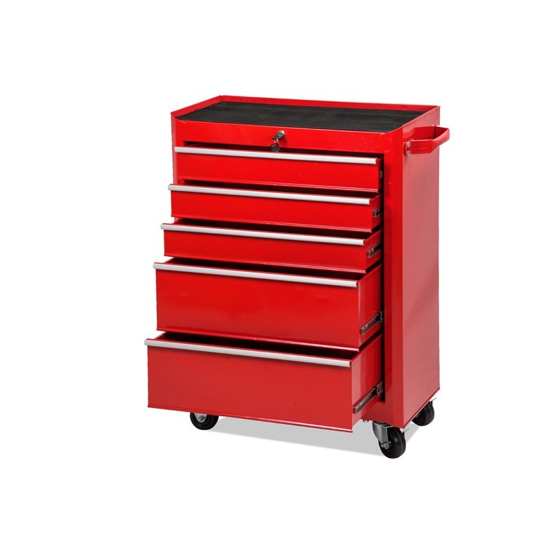 Carrello portautensili in acciaio a cinque cassetti dotato di maniglia per un trasporto agevole e quattro ruote, due fisse e due pivottanti, cassetti con fogli antigraffio e due chiavi in dotazione. Dimensioni: 77x33x69cm. Articolo destinato ad esclusivo uso domestico. Non adatto ad uso pubblico.