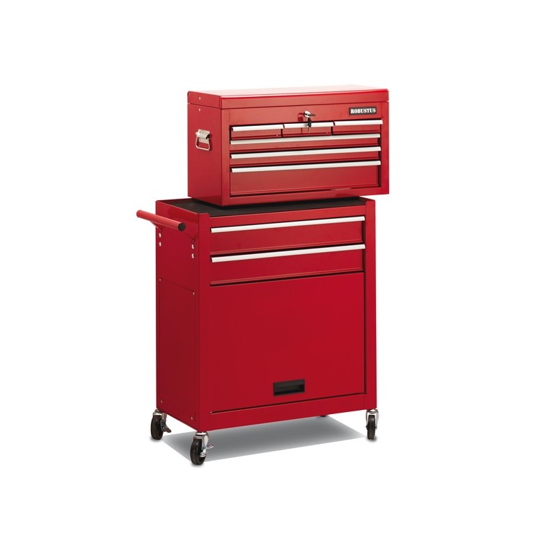 Carrello portautensili in acciaio scomponibile in due parti: la parte inferiore è dotata di quattro ruote pivottanti, un vano accessibile frontalmente con sportello a ribalta, un pannello laterale, un lato forato per appendere ganci portattrezzi, due cassetti di grandi dimensioni, due chiavi in dotazione. La parte superiore, che puo essere rimossa, è una cassettiera costituita da box con coperchio fornito di chiave e di sei cassetti e puo essere infilata all interno della parte inferiore. Dimensioni: 74,5/108x33x61,5cm. Articolo destinato ad esclusivo uso domestico. Non adatto ad uso pubblico.