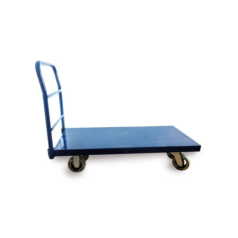 Carrello piatto prodotto in lamiera rinforzata e una sponda in acciaio. Verniciato di color blu con quattro ruote di cui due girevoli e due fisse. Portata massima 500 kg. Dimensioni: 90x60x121cm.Articolo destinato ad esclusivo uso domestico. Non adatto ad uso pubblico.