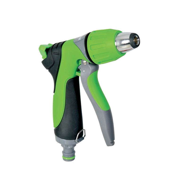 Pistola per irrigazione resistente agli urti agli agenti atmosferici e ai raggi UV. Impugnatura ergonomica. Corpo in alluminio. Irrigazione a spruzzo regolabile.