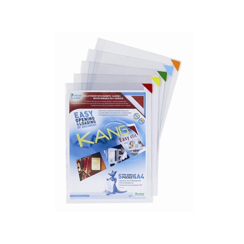 Robuste cartelline a L in PVC con retro adesivo, apertura a L e chiusura tramite magnete angolare rosso. Confezione da 5 pezzi, capaictà 10 fogli. Removibile e riutilizzabile. Dimensione: F.to A4 23,2x32,2cm. Colore: cf multicolor.