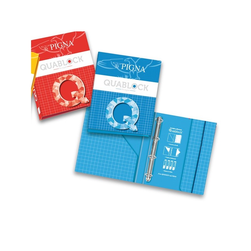 Raccoglitori ad anelli Quablock realizzati in cartone robusto ed anelli in acciaio cromato. Dotati di tasche interne ed elastico per la chiusura. Dispositivo 4 anelli, tondi. Colori assortiti. Formato anelli 30mm di diametro. Formato A4.