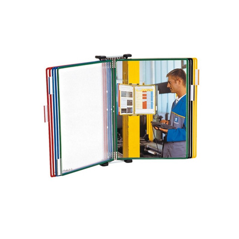 Base in metallo con 10 buste in PVC con apertura superiore e bordo rinforzato con anima in acciaio e 5 cavalierini da 50 mm. Angoli in plastica che permettono di inclinare il leggio per facilitare la lettura - Ampliabile all’infinito. F.to A3. Colore: multicolor.