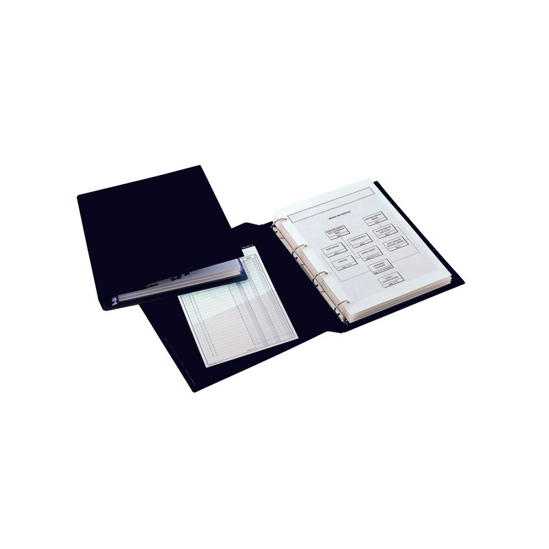 Raccoglitore in Colpan 2000® (cartone rivestito in PVC espanso), spessore 1 mm, con meccanismo a 4 anelli (a D) e tasca interna trasparente. Adatto a contenere documenti, disegni, poster, cartine geografiche, cartelli pubblicitari, stampe. Destinato a durare nel tempo. Formato esterno: 350x440 mm. Formato contenuto: 300x420 mm (A3 libro, anelli sul lato lungo). Dorso: 40 mm. Diametro anelli: 25 mm. Colore nero. Buste forate idonee a catalogo: codici 25997 e 26044.