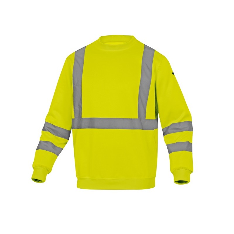 Felpa sportiva con polsini e parte bassa della felpa con bordo a coste. Bande a bretella colore argento. Colore giallo fluo. Categoria DPI: 2. Certificazione CE. Conformità alle norme EN ISO 13688:2013 e EN ISO 20471:2013 /A1:2016.