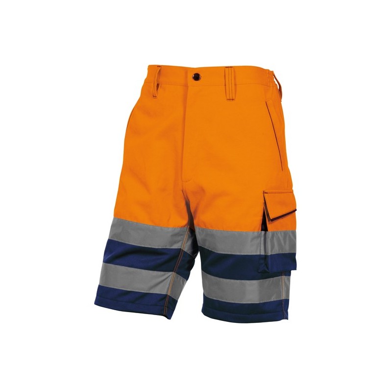Bermuda con elastico in vita. Alta visibilità , strisce colore argento. Dotato di 5 tasche. Arancio fluo. Categoria DPI: 2. Certificazione CE. Conformità alle norme EN ISO 13688:2013 e EN ISO 20471:2013 /A1:2016.
