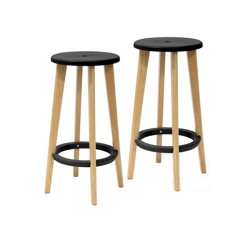 Sgabelli con seduta e anello poggiapiedi in robusto ABS e gambe in faggio verniciato. Altezza della seduta 76cm. Dimensioni: Ø33cm - H76cm. Consegnato smontato (di facile assemblaggio).