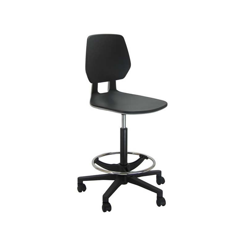 Seduta alta con schienale mendio e poggiapiedi regolabile. Sedile e schienale interamente in polipropilene sanificabile. Schienale fisso. Elevazione a gas. Base in nylon.