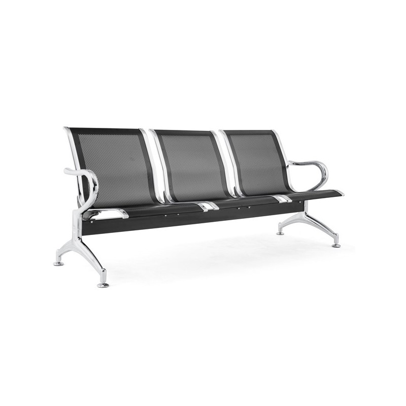 Panca per sala d'attesa in acciaio microforato con trattamento antiruggine e verniciatura elettrostatica. Spessore lamiera 1,5mm. Profili, gambe e braccioli in acciaio cromato.