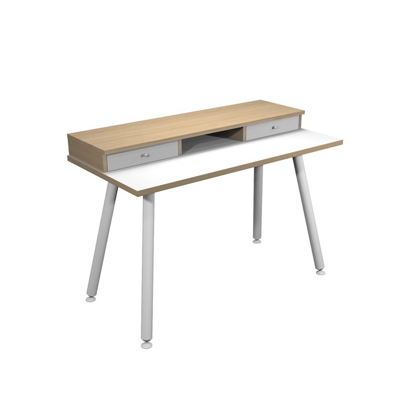 Postazioni di lavoro dalle dimensioni ideali per lo smart-working. Lo stile di influenza scandinava, caratterizzato dal design minimale delle gambe e dall’abbinamento del bianco con la finitura naturale del rovere, offre la possibilità di allestire la postazione in qualunque ambiente domestico. Materiale bilaminato nobilitato melaminico conforme alle norme UNI e EN classe E1. Il sopralzo, completo di due utilissimi cassetti (dimensioni utili L328 P235 H68 mm), e di un vano a giorno (dimensioni utili L368 P300 H82 mm), permette di posizionare il monitor del pc più in alto rispetto al piano di lavoro, consentendo di migliorare l’ergonomia della postazione. Dimensioni totali: 1200x600xH844 mm.