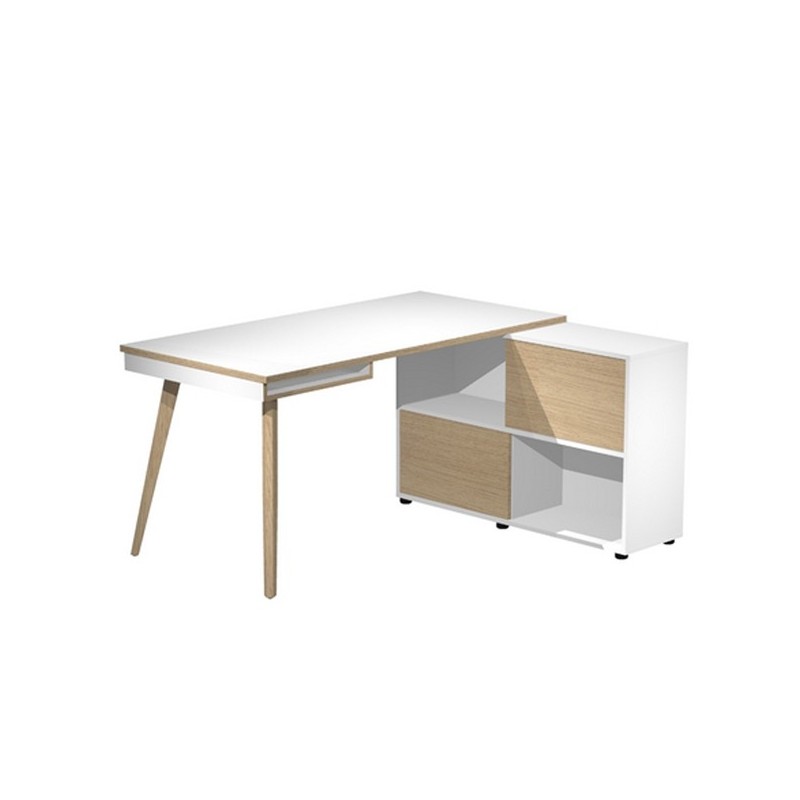 Postazione compatta con ampio piano di lavoro sorretto da un lato da un pratico mobile di servizio portante a quattro vani completo di due ante scorrevoli e piedini regolabili in altezza e dall’altro da una coppia di gambe in legno massello con piedini livellabili in altezza. Nicchia porta oggetti/documenti sotto il desktop in corrispondenza delle gambe (aperta su due lati). Postazione reversibile destra/sinistra. Le ante possono essere assemblate sul contenitore sia lato scrivania che lato esterno del contenitore. Materiale bilaminato nobilitato melaminico spessore conforme norme UNI e EN classe E1, antigraffio ed antiriflesso.