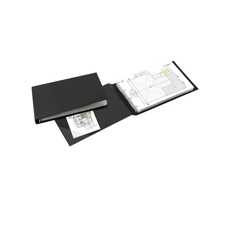 Raccoglitore in Colpan 2000® (cartone rivestito in PVC espanso), spessore 1 mm, con meccanismo a 4 anelli (a D) e tasca interna trasparente. Adatto a contenere documenti, disegni, poster, cartine geografiche, cartelli pubblicitari, stampe. Destinato a durare nel tempo. Formato esterno: 480x315 mm. Formato contenuto: 420x300 mm (A3 album, anelli sul lato corto). Dorso: 40 mm. Diametro anelli: 25 mm. Colore nero.