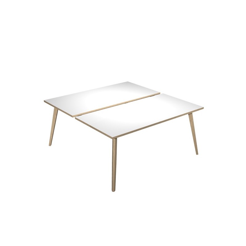 Linea di arredo operativo dal design confortevole ed essenziale caratterizzata dalle preziose gambe in LEGNO MASSELLO inclinate delle scrivanie e dei tavoli rotondi. Robusti piani in melaminico sp. 22 mm con bordo antishock resistente agli urti in ABS 3 mm. Gambe in legno massello complete di piedini livellabili in altezza. Piani In materiale bilaminato nobilitato melaminico spessore 22 mm conforme norme UNI e EN classe E1. Scrivanie stabili e robuste grazie alla struttura rafforzata da quattro travi in metallo di collegamento fra le 4 gambe in legno massello Ø50mm.