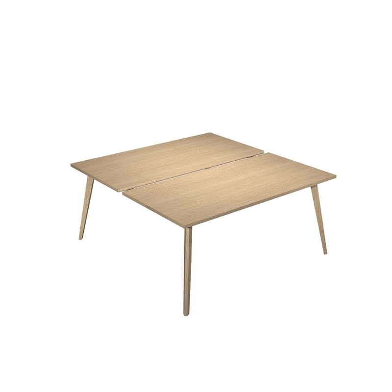 Linea di arredo operativo dal design confortevole ed essenziale caratterizzata dalle preziose gambe in LEGNO MASSELLO inclinate delle scrivanie e dei tavoli rotondi. Robusti piani in melaminico sp. 22 mm con bordo antishock resistente agli urti in ABS 3 mm. Gambe in legno massello complete di piedini livellabili in altezza. Piani In materiale bilaminato nobilitato melaminico spessore 22 mm conforme norme UNI e EN classe E1. Scrivanie stabili e robuste grazie alla struttura rafforzata da quattro travi in metallo di collegamento fra le 4 gambe in legno massello Ø50mm.
