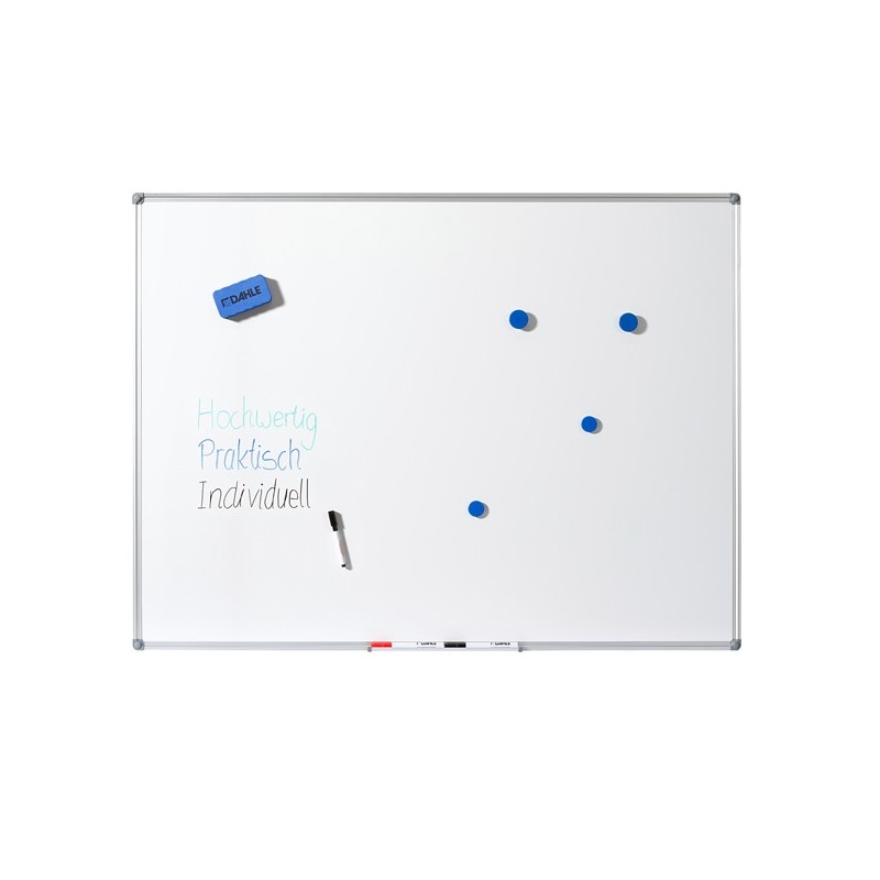 Lavagna bianca con superficie in acciaio laccato, magnetica, scrivibile e cancellabile con marcatori a secco. Robusta cornice in alluminio estruso di alta qualità con angoli in plastica per la massima stabilità. Completa di vassoio porta accessori da 30cm e kit di montaggio.