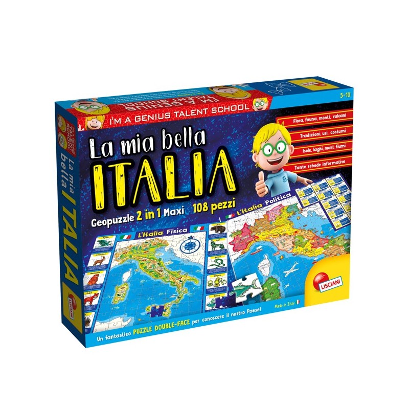Puzzle doubleface dimensioni 70x50cm. Italia fisica e politica. Età consigliata: 5-10 anni.