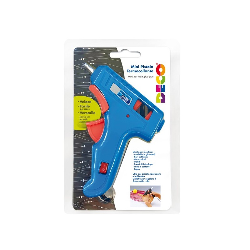 Pistola che consente di incollare oggetti di ogni tipo di materiale: cartone, stoffa, ceramica, legno, ferro, plastica, vetro, gomma ecc. Alimentata a corrente. Dotata di grilletto per la regolazione del flusso della colla. Utilizza stick da 7mm x 10cm.