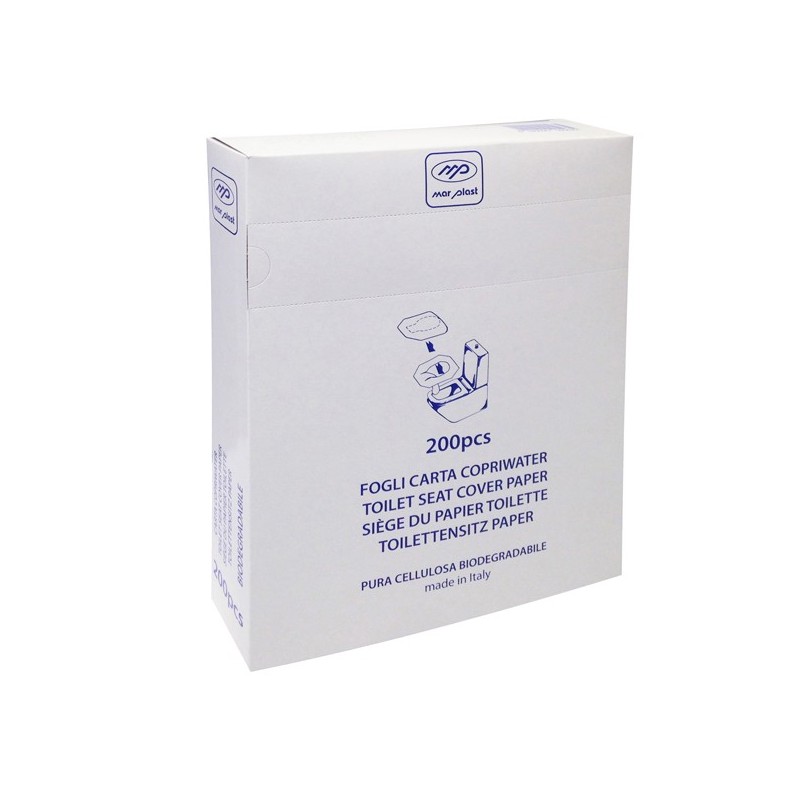 Carta copri WC bianca in fogli. Composizione 50% cellulosa vergine e 50 % fibre riciclate. Forma del copri WC: rettangolare con fustellatura centrale ricalcante la sagoma del sedile. Dimensioni del copri WC: 42x37,5cm. Adatta per dispenser cod. 61096.