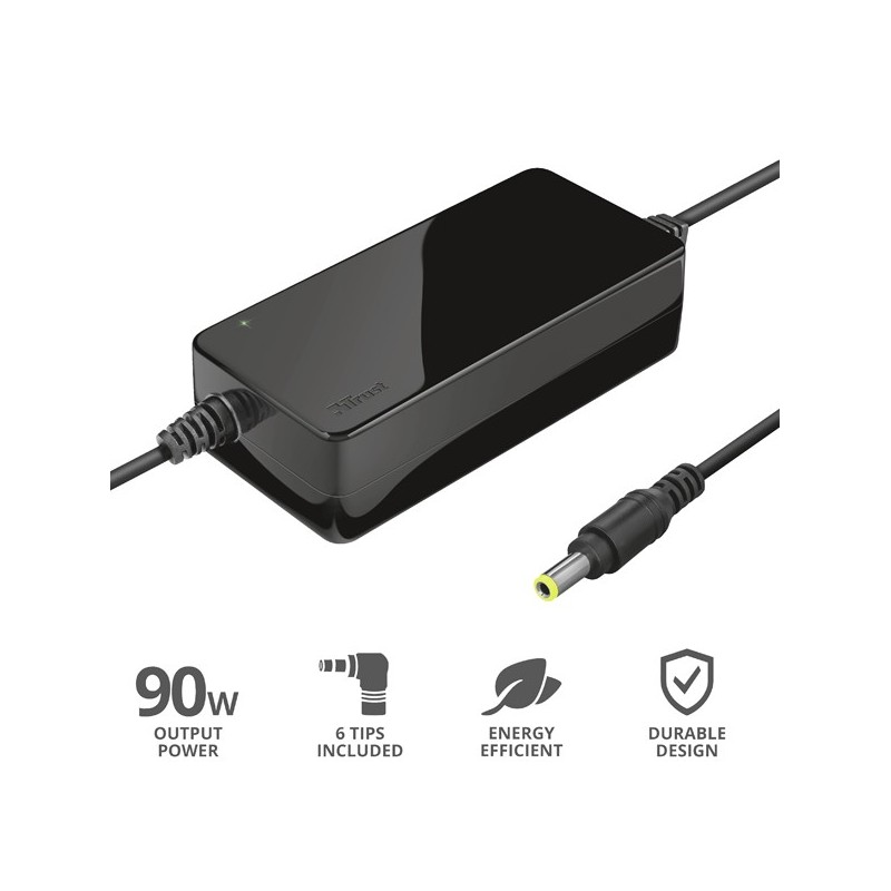 Caricabatterie universale da 90 W per laptop. Funziona praticamente con qualsiasi laptop. Dotato di cavo di alimentazione a rete e connettore standard con 6 spinotti intercambiabili.