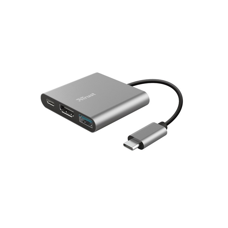 Con l'adattatore multiporta Trust Dalyx 3-in-1 USB-C, è possibile ottenere il massimo dal laptop. E' possibile aumentare il numero di porte sul laptop e collegarsi a più dispositivi attraverso la porta HDMI, USB-A e USB-C per la ricarica. Versatile adattatore multiporta adatto per ogni laptop, MacBook e tablet dotato di porta USB-C. L'adattatore Dalyx consente di trasferire dati in modo estremamente rapido attraverso due porte USB-A alla velocità massima di 5 Gbps tramite USB 3.2 Gen1. Non occorre installare alcun software aggiuntivo, basta inserire la spina e partire! Con un'unica porta USB-C sul dispositivo, Dalyx offre una connettività versatile. Collegando il tablet o il laptop a un monitor o alla TV tramite la porta HDMI, è possibile vedere film e foto ad altissima risoluzione con colori nitidi grazie allo standard HDMI 1.4 (4k30Hz), ricaricare il laptop dalla porta USB-C con tecnologia PD (Power Delivery) e aggiungere altri dispositivi come la tastiera o un drive esterno tramite la porta USB-A. L'adattatore si presenta in una resistente struttura in lega di alluminio pressofuso, che rappresenta un complemento raffinato per arredare la scrivania e il kit di lavoro, ma è anche perfetto per i viaggi grazie al formato compatto.