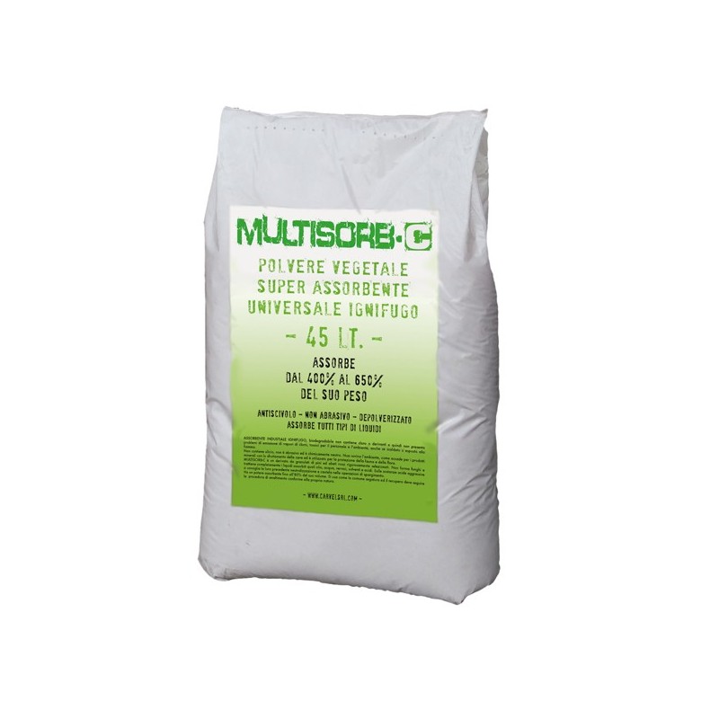 Polvere vegetale ignifuga per tutti i tipi di liquidi e grassi. Assorbitore industriale resinoso con capacità d'assorbimento dal 400% al 650% del proprio peso. Assorbe ogni tipo di liquido, olio, acqua, solventi, inchiostri, acidi deboli e basi, prodotti chimici, sostanze grasse, grassi, così come miscugli ed altra sporcizia sparsa incidentalmente sui terreni. Composto da lignina e cellulosa. Non contiene argilla né silicone. Raccomandato per l'utilizzo su strade ed autostrade della rete stradale nazionale. Distruzione attraverso incenerimento o conferimento alla discarica seguendo la regolamentazione in vigore e in base al prodotto assorbito. Conforme alla norma UNI CEN/TS 15366:2010