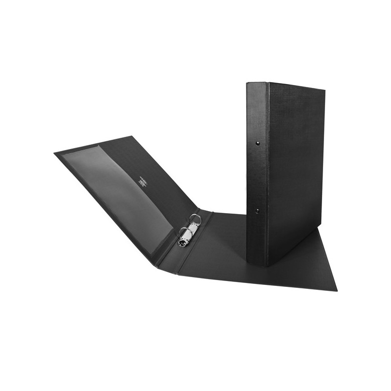 Raccoglitore in Colpan® (cartone rivestito in PVC) con meccanismo a 2 anelli tondi e tasca interna trasparente. Ideale per archiviare qualsiasi tipo di documento. Formato esterno: 265x310 mm. Formato contenuto: 220x300 mm (A4). Dorso: 30 mm. Diametro anelli: 25 mm. Colore nero.
