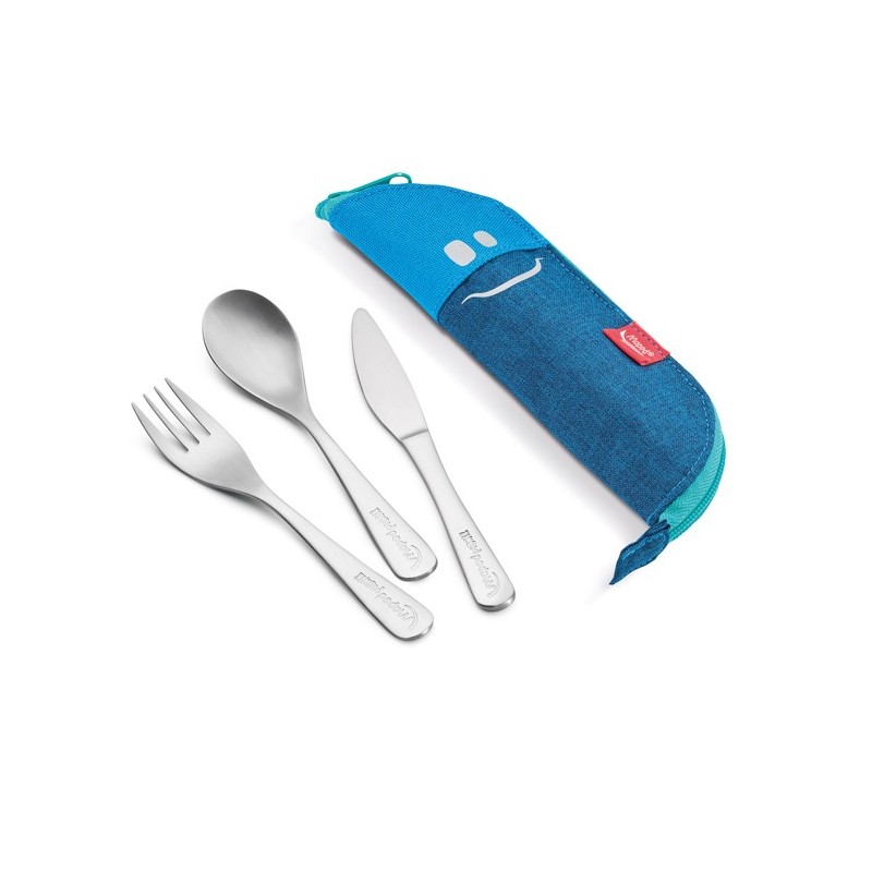 Astuccio in tessuto con posate in acciaio inox 430 dimensione bambini (forchetta, coltello, cucchiaio).