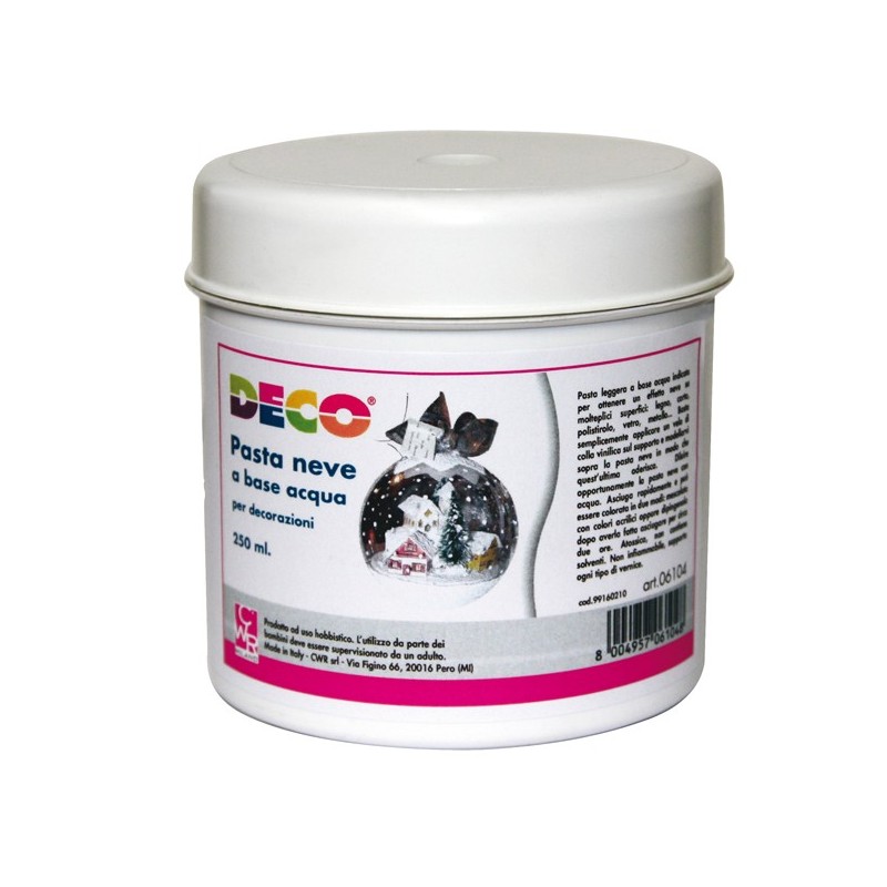 Materiale molto leggero a base acqua con cui è possibile ottenere un effetto “neve” o “pelliccia” su moltissime superfici: legno, polistirolo, pareti, carta, plastica, metallo, vetro… Asciuga rapidamente e può essere colorata in due modi: mescolandola con colori acrilici oppure dipingendola dopo averla fatta asciugare per circa 2 ore.