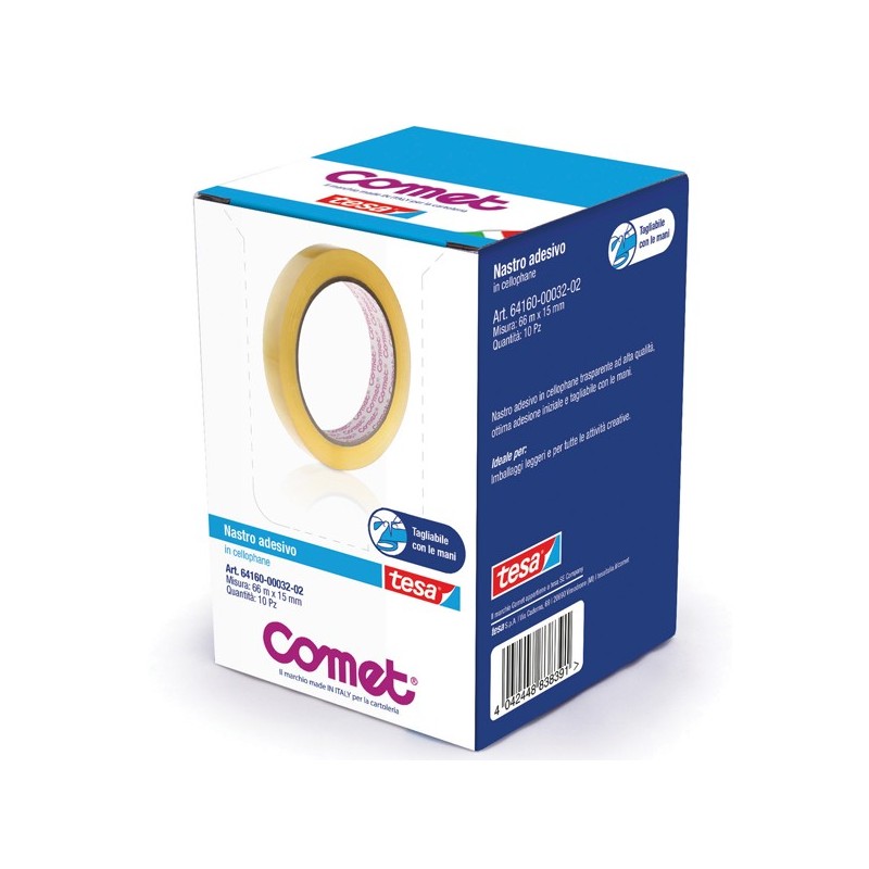 Nastro adesivo - confezionato singolarmente - 15 mm x 66 m - cellophane - trasparente - Comet